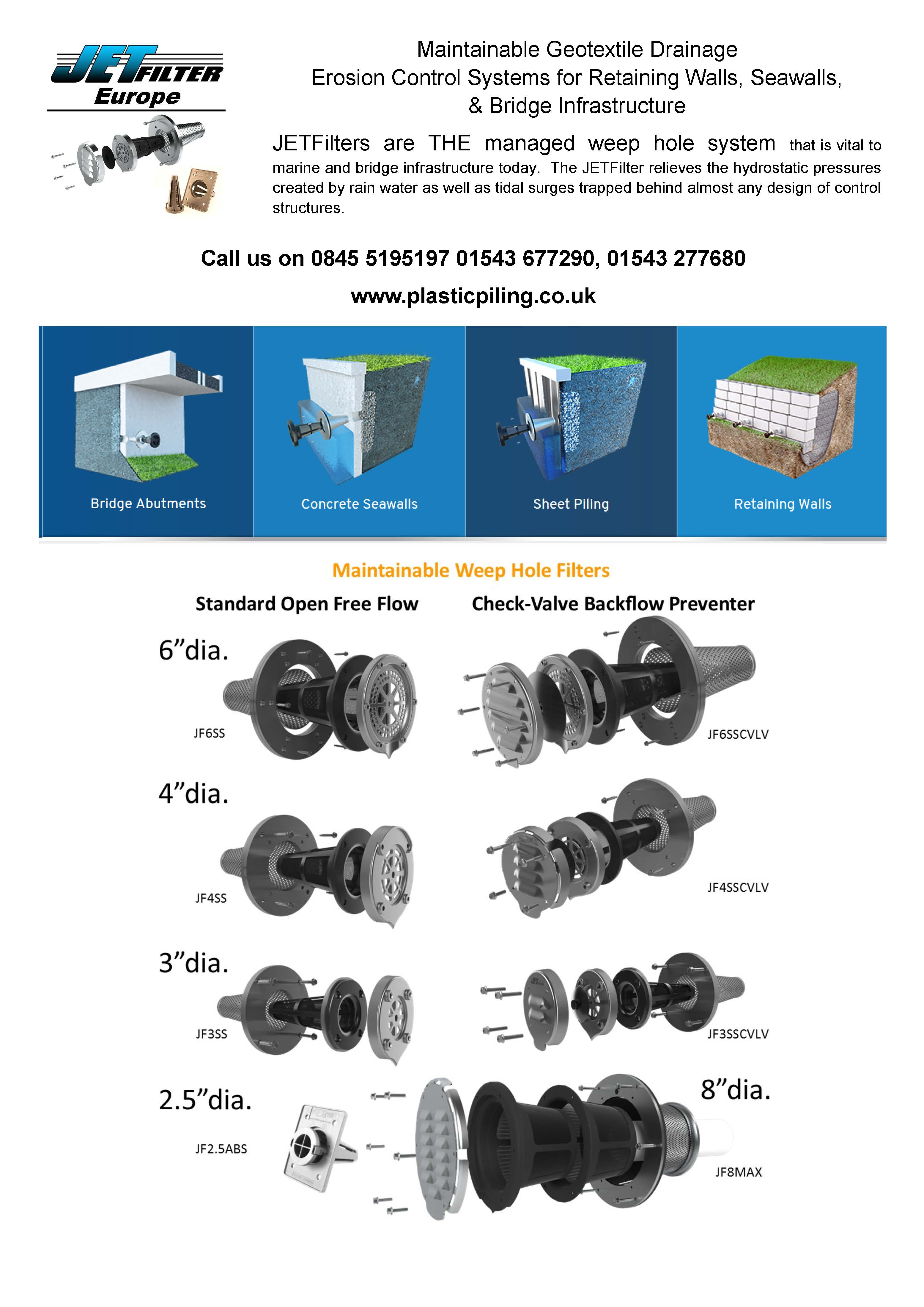 THE Plastic Piling Company are the UK and Ireland distributors for the JET Filter System weep hole drainage filters.  The JET Filter is a very innovative solution to the age old problem of relieving water pressure, that can builds up, behind retaining structures, such as retaining walls, seawalls, bridge abutments.