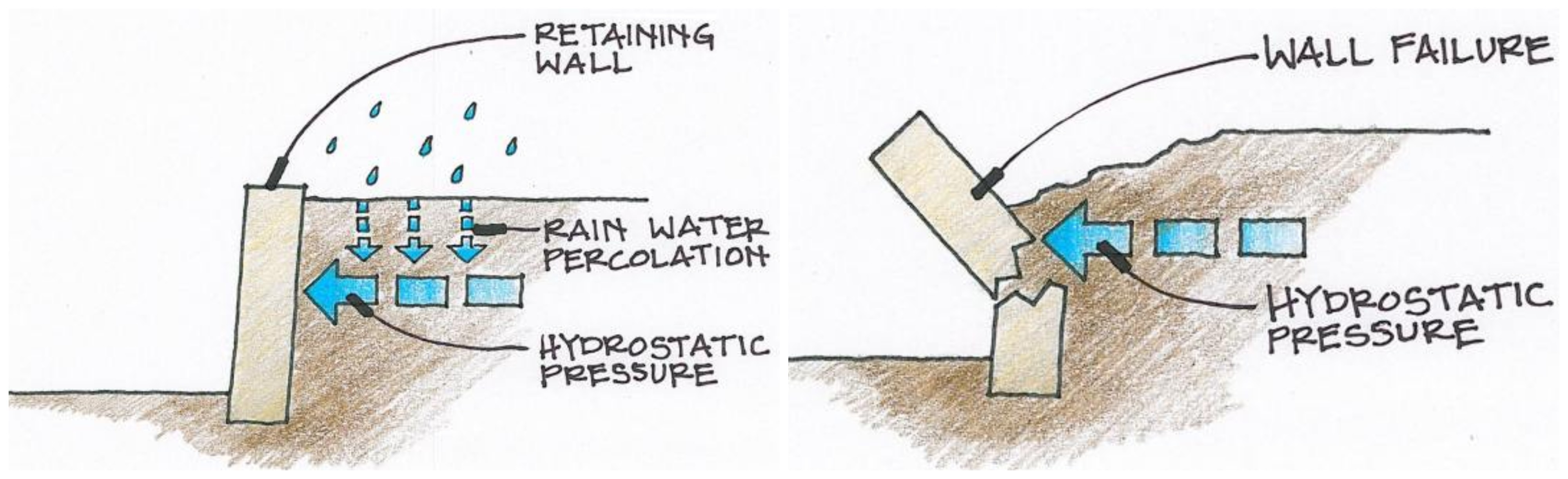 Lack of proper drainage is one of the most common causes of retaining structure failure. If left uncontrolled, this water “hydrostatic” pressure, can build up leading to the failure of that structure, through overloading its design.