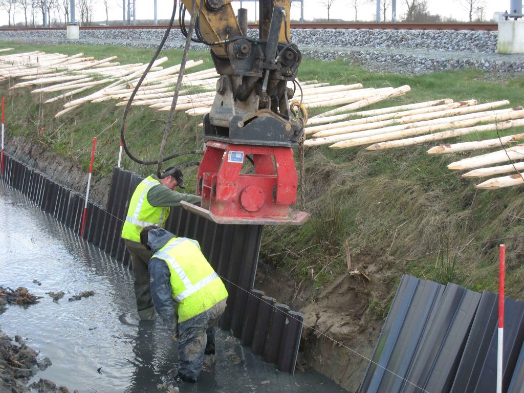 • When installing steel sheet piling, there is a lot more types of equipment that can be used for steel, pile presses, hydraulic impact hammers.  With plastic piling we are mostly limited to using piling vibrators.