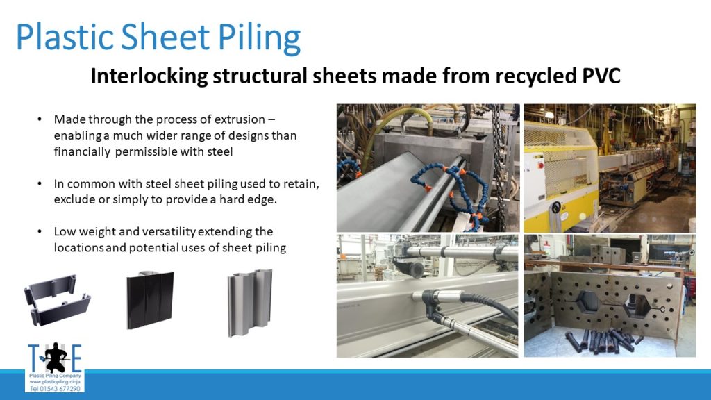 Most sheet piling applications need long lasting solutions, such as retaining structures, flood defences, cut-off walls, erosion control, and scour protection, clearly it makes sense that plastic “benefit” piling.  Providing a solution for plastic waste, not a contributor.