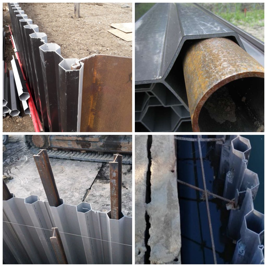 • Plastic piling interlocks are much more watertight than cold form trench sheeting, so are excellent options for damming or cut-off structures.    So long as the sheet pile can driven to the required cut-off depth, the longevity of the plastic sheet piling puts it in a different league to that of steel sheet piling.