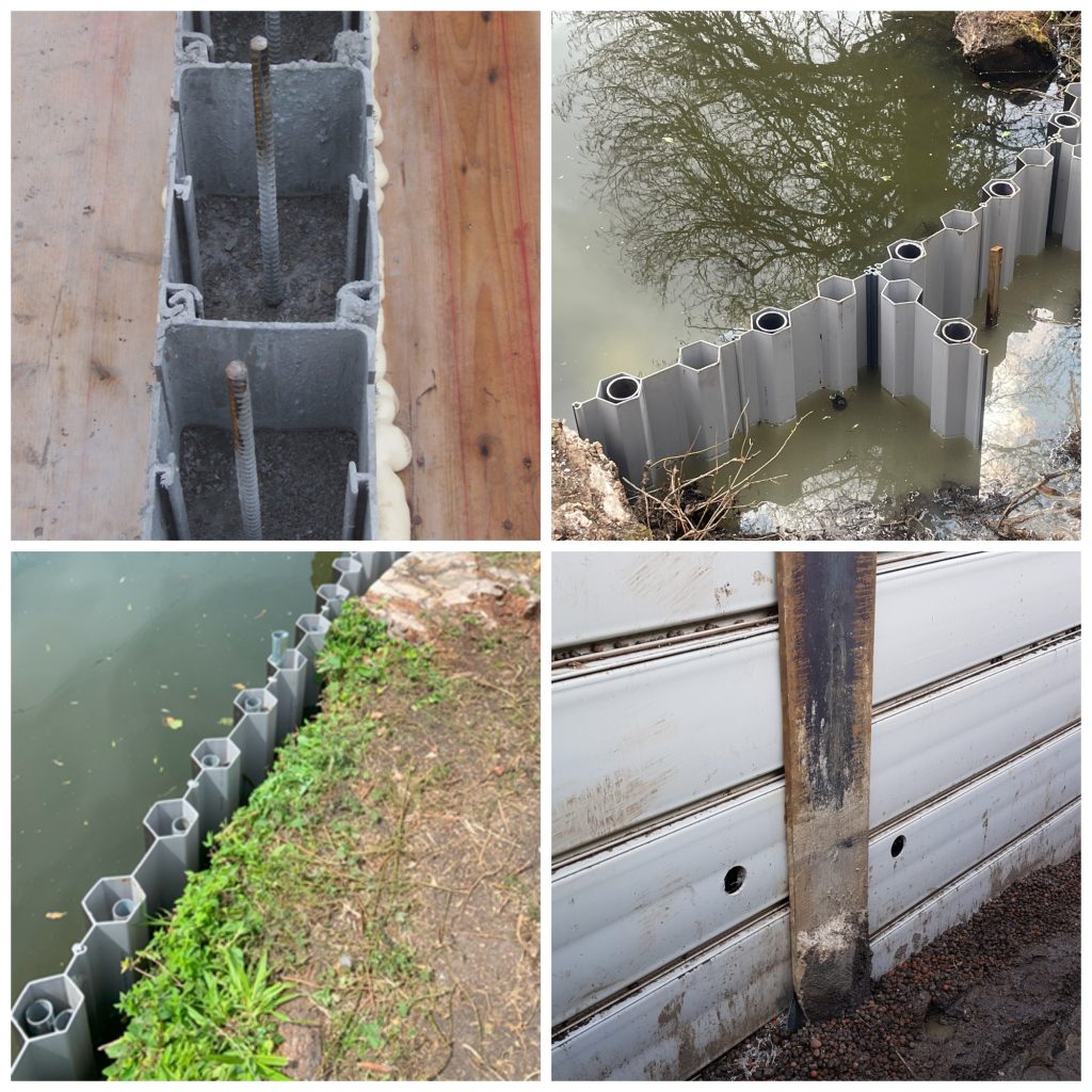 Providing durable long lasting solutions, often in hard to reach areas.  The method that the plastic piling is produced is call extrusion, and this process enables the production of a much wider spectrum of sheet pile designs than is financially or technically viable with steel sheet piling.  Meaning that whilst we can offer traditional U and Z piles, as for steel, we can go beyond what is possible with steel, and offer novel, more versatile sheet pile designs.