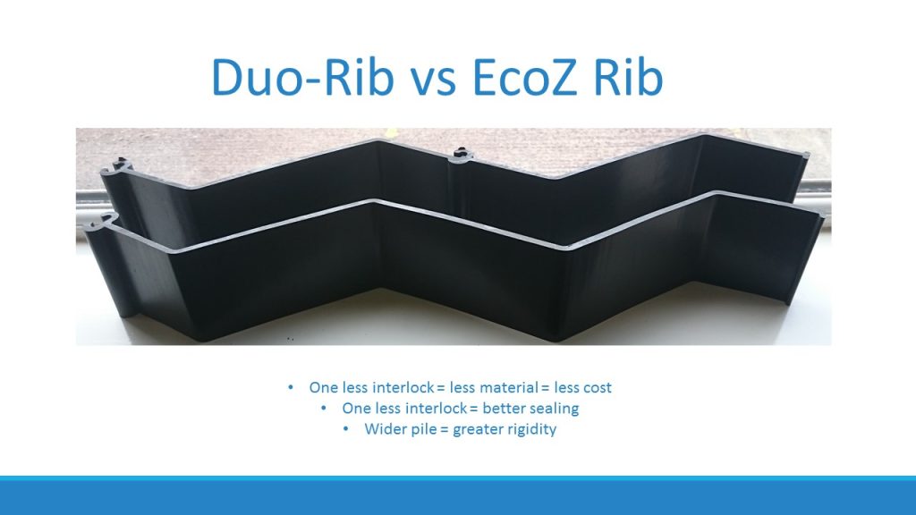 So if the Europile is an improvement upon the box format, is there a better product for the rib format? Yes, THE DuoRib, this is exactly the same as two EcoZ, but with one less interlock, so there is greater rigidity, better sealing performance and is cheaper. In fact the DuoRib is the cheapest plastic pile of our range and extremely popular for applications that prefer to dig in, or manually drive the sheets.