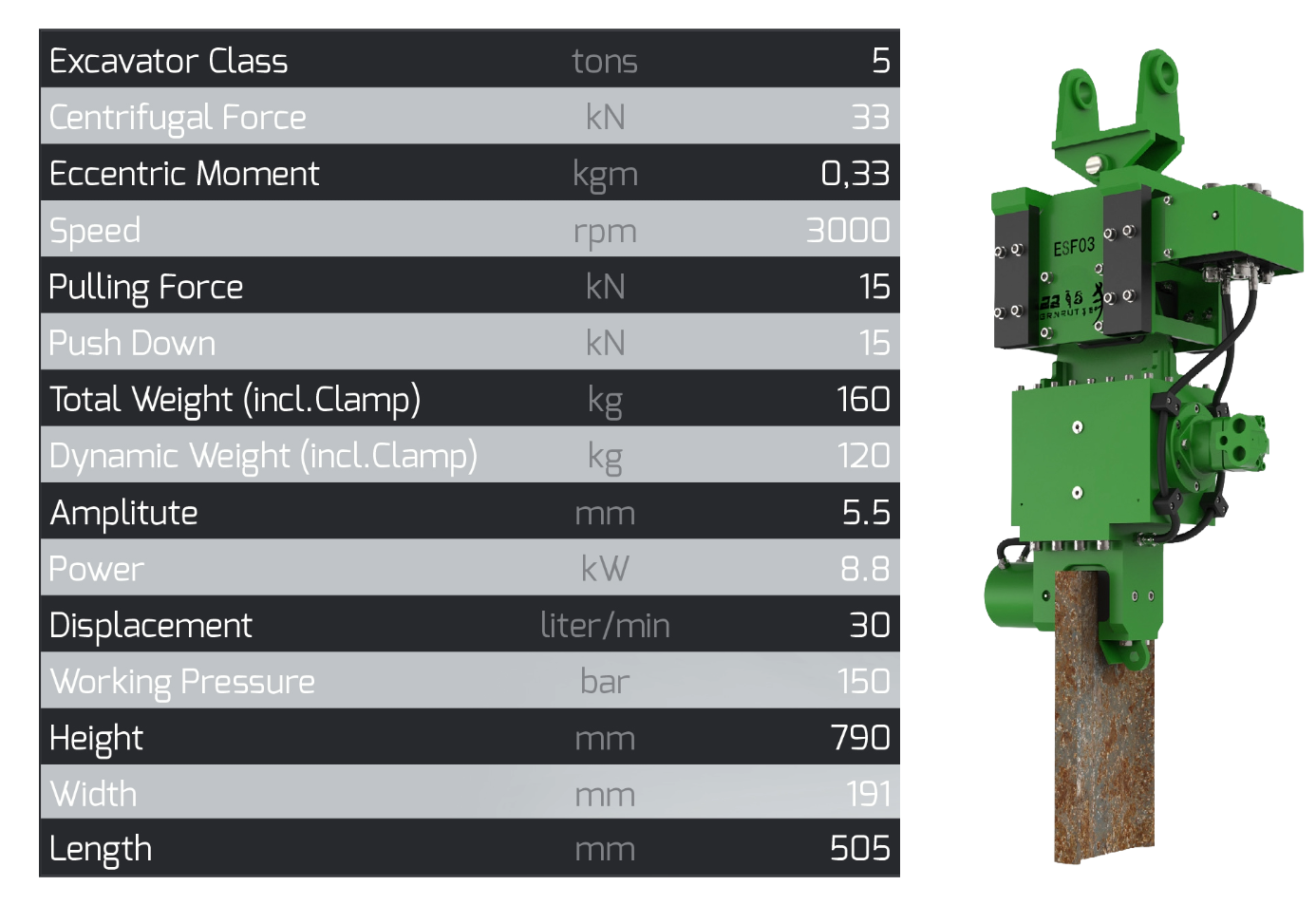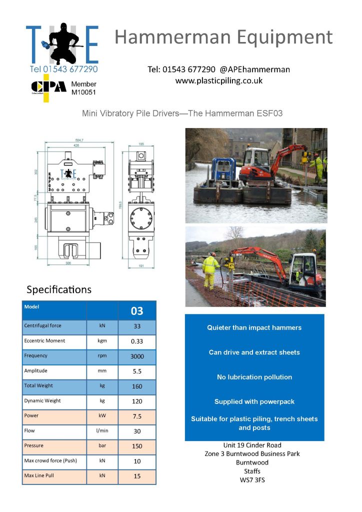 The ESF03 does include a hydraulic clamp, so the sheet piling is gripped. So unlike a compactor plate or post driver, the ESF03 can extract sheets.