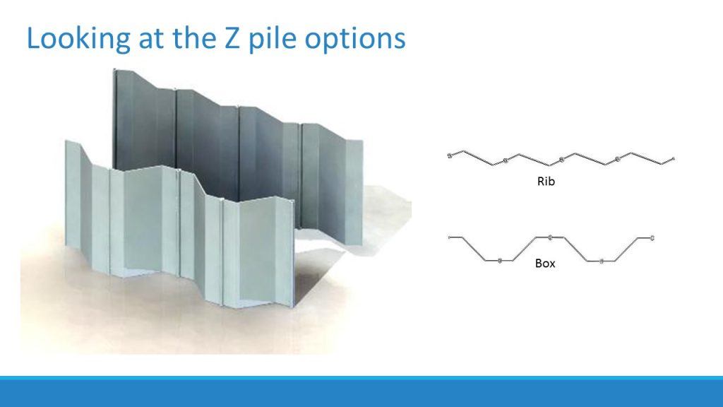 Z piles can be used in two formats, over time these have been referred to as ‘box’ or ‘rib’, the former is the standard wayZ piles are used, and so creates a ‘U’ shape through alternation of the profiles. This box design maximises the strength of the sections, through the provision of a deeper cross section and higher section modulus. The rib configuration in contract provides maximum coverage and is also a more stable orientation for thinner budget pilings as there is less chance of buckling due to slenderness issues. The Europile in contrast provides the same coverage and maximum strength, exemplifying why this product has effectively replaced the Eco Z type profiles.